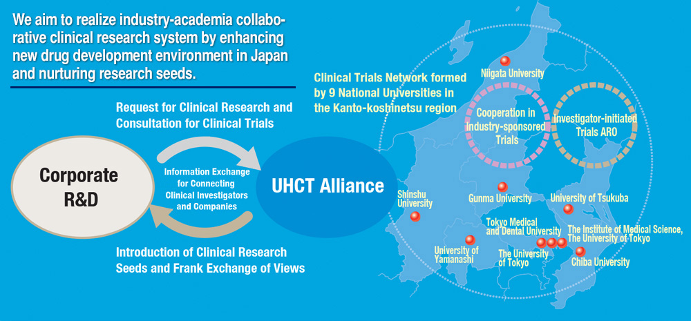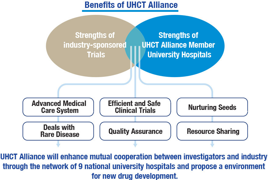 The Alliance aims to provide drugs and medical devices with high medical needs by promoting investigator-initiated and industry-sponsored clinical trials through collaboration and cooperation between high performing university hospitals.In addition, contribute as a model project in regional cooperation of the University Hospital Clinical Research Promotion Initiative.