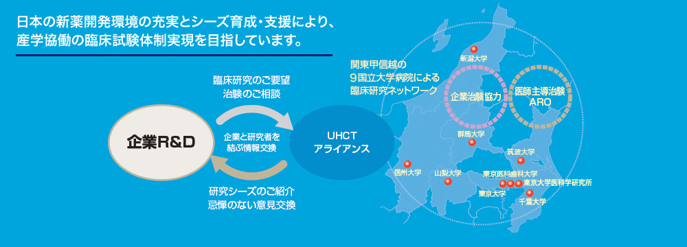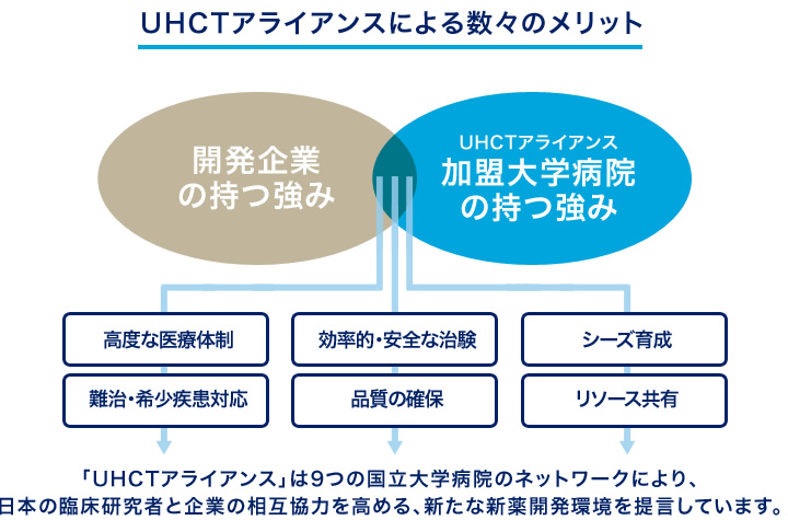 医療ニーズの高い医薬品や医療機器を日本の患者により早く供給するため、高い実績のある大学病院が連携・協力関係を結び、安全かつ効率的な治験・臨床試験を実施します。大学病院という特性を活かし、難治・希少疾患などアンメットメディカルニーズの高い医薬品の開発にも、積極的に協力します。